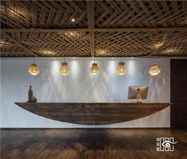设计的重点逻辑在于表达了每一组家具的形式,每一个细节的表达,家具即是这出戏的主角。配以如荷花一般挺立的“飘浮椅”,再用当地盛产的细竹编制成的网格作为吊顶,透过灯光把竹影撒向了白色的墙面,如此来表达一种扁舟浮水面的意境。