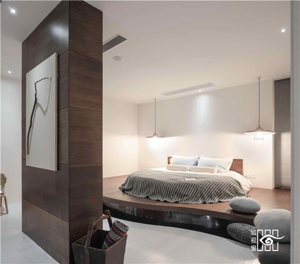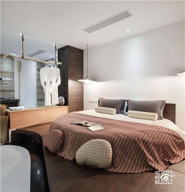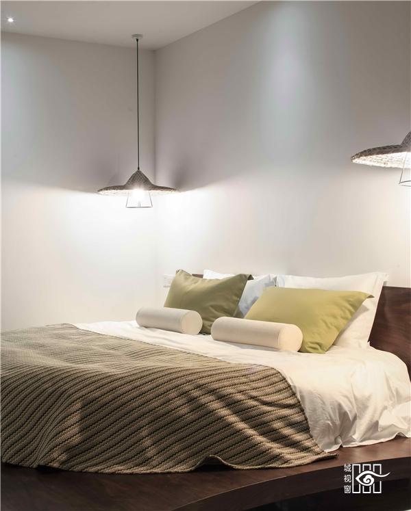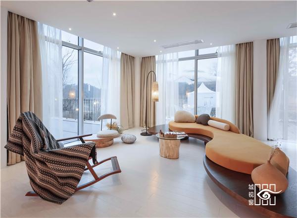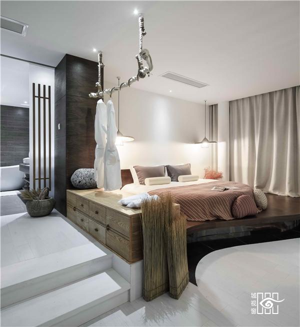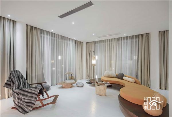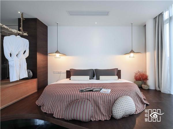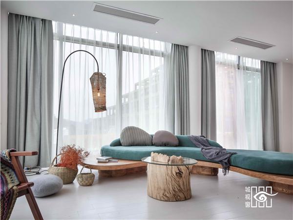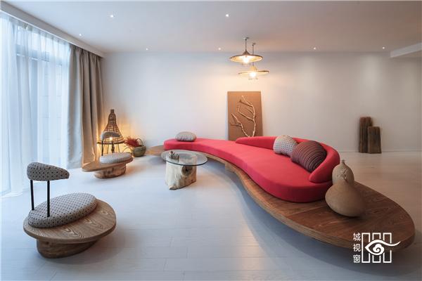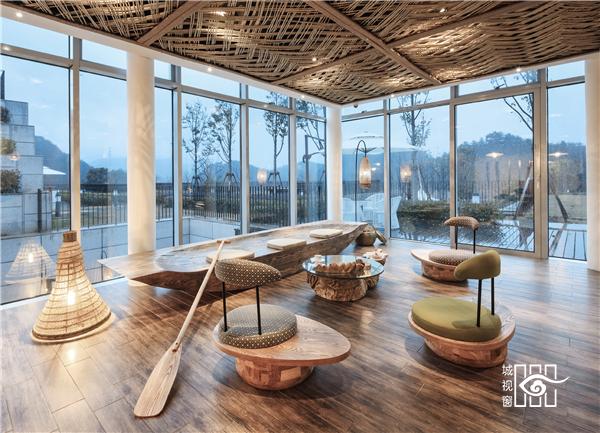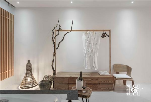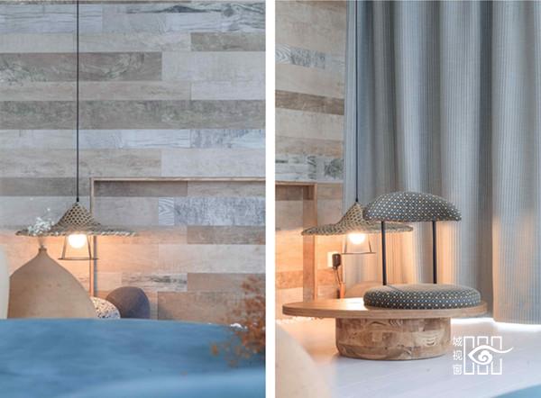 每一间客房里,都用以一颗石子触碰水面那一刹那的波动作为沙发的形式出现。涟漪一般的撒出几轮优雅的弧线,便成就了空间里的水的动与静态。我们寻找出一颗树、一支藤、一颗石子、一个鱼娄,经过精细的加工,小心翼翼的放置,就像它们本该属于这里,填补出整个构图中的主次角色。