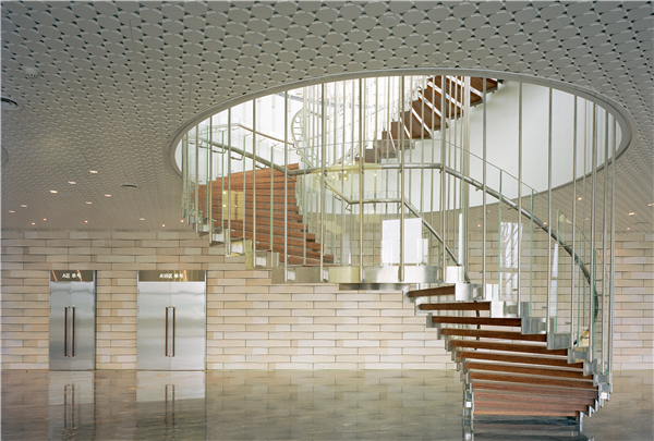 设计师采用了一种具有芬兰特色的材料,在主观众厅临湖休息大厅一侧的弧形墙上覆盖经特别设计的玻璃砖。