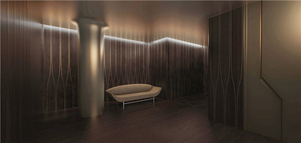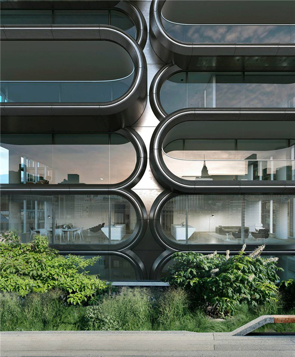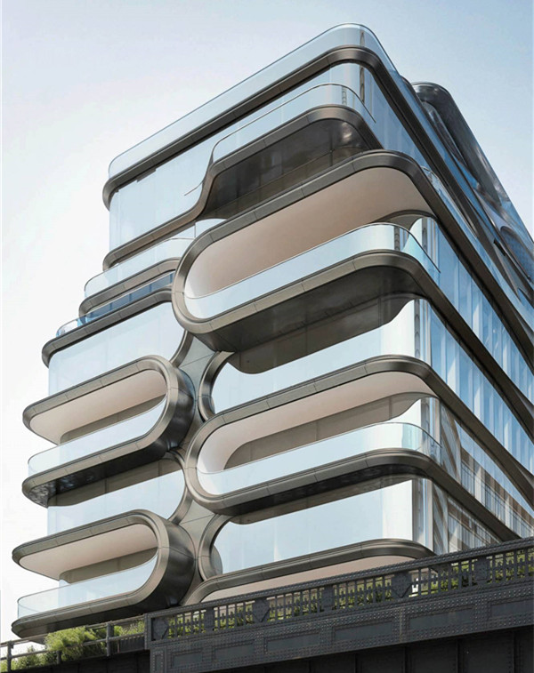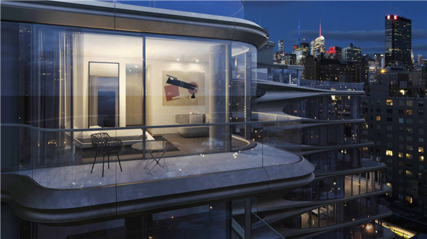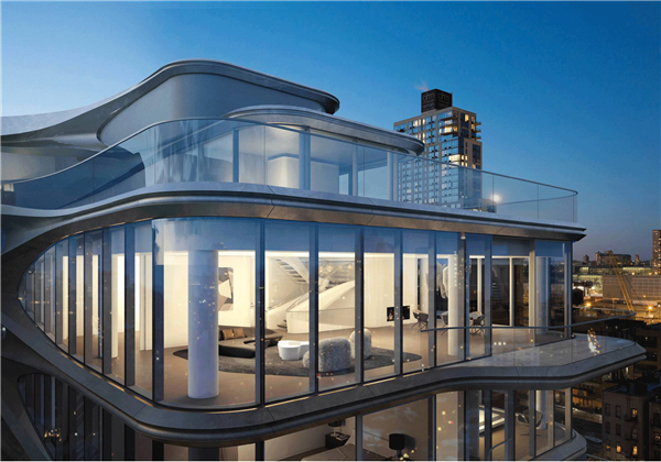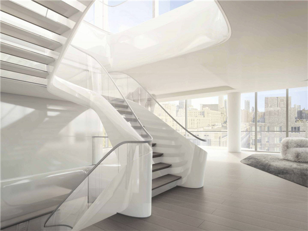 纽约普通的住宅建筑本是直角结合直墙,而哈迪德女士设计这套住宅的最大创新是动态曲线的应用。建筑物手工打磨金属外立面直冲云霄,创造一个多层次的、连接室内和室外的流动空间。