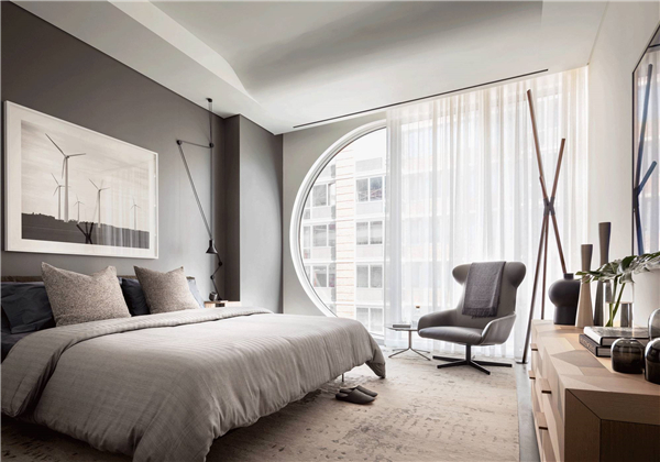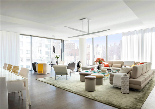 室内设计师 Jennifer Post 的任务是打造其中的四居室户型。418平公寓采用柔和色调,搭配流行色彩艺术品。