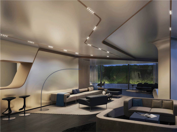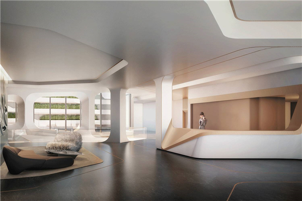 墙面的自由流体装饰与雕塑感极强的前台为大堂带来极强的未来感。