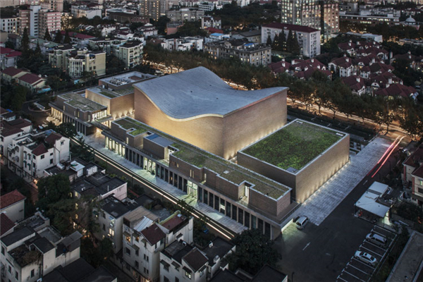 音乐厅位于上海复兴中路1380号,建筑面积为19950平方米,由1200座演奏厅和400座的室内乐演奏厅组成。外部朴素的陶土砖和顶部灵动的曲面相结合,就像一只“大马鞍”。