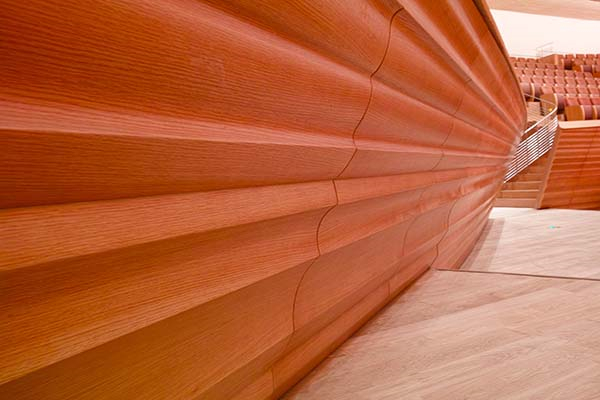 ▲主厅的墙面上设置有6块大型橡木反声板,表面经过雕花处理使其呈现出不规则的形态,每一块反声板都有不同的角度和大小。