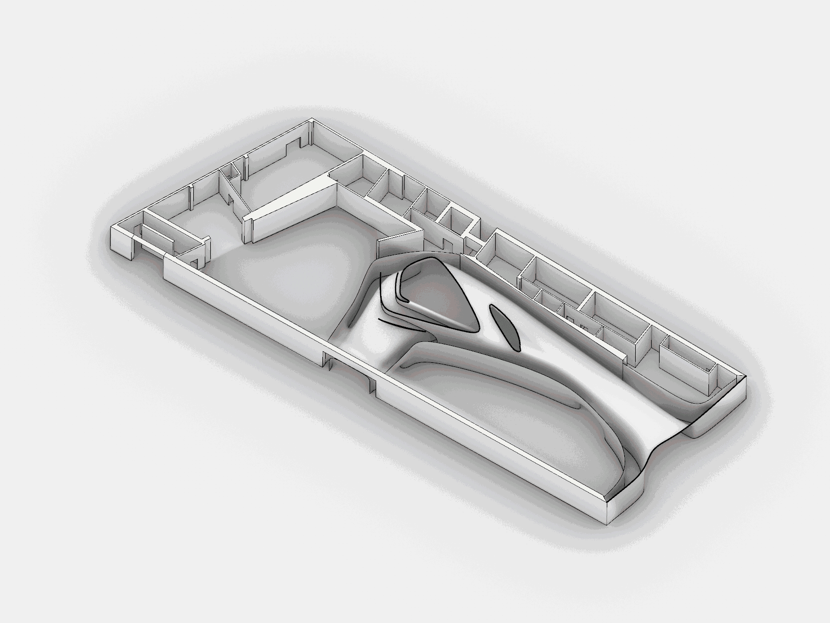 首先,走廊与水平展览空间的联系。全部为非线性空间的走廊,通过与展示空间的联系,使展示空间也成为了“半”非线性空间,同时通过出入口与城市空间产生联系,让建筑与城市相接的外立面也具有了非线性的特质。