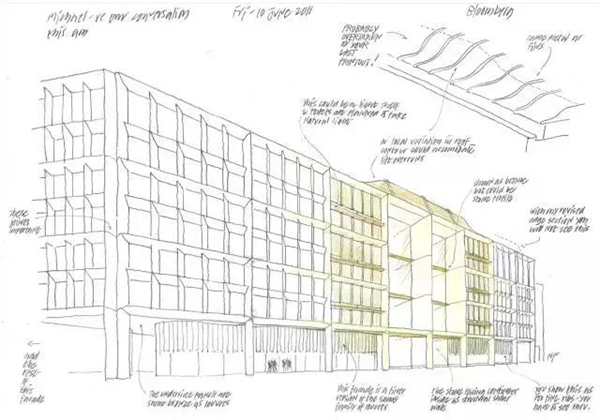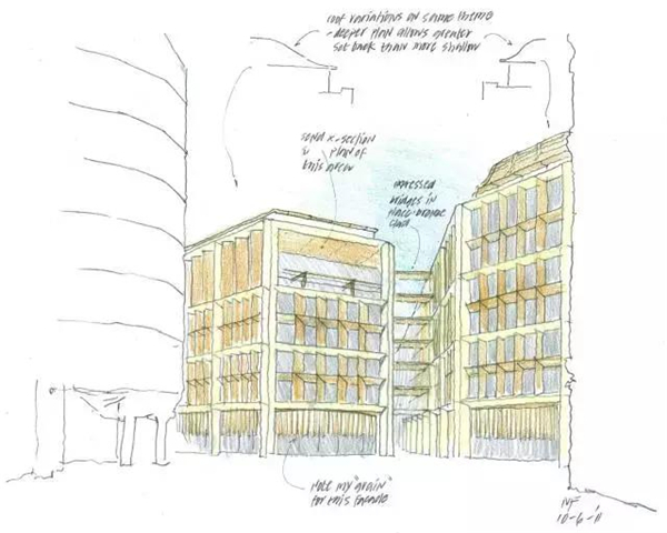 我们先来看看福斯特关于外墙立面的设计手稿 ▼