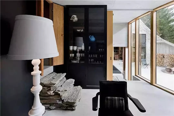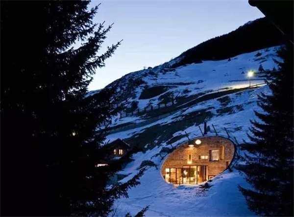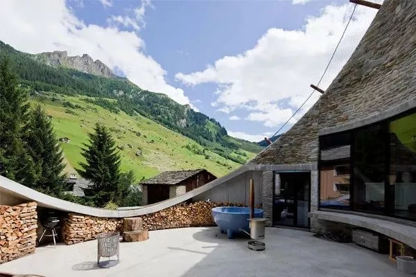 瓦尔斯别墅(Villa Vals),坐落于瑞士东南部阿尔卑斯山脉的一个斜坡上。整座别墅主要由山石和木材组成,开口处被设计成一个向下凹陷的球面结构,完美融入周围环境,毫不突兀。