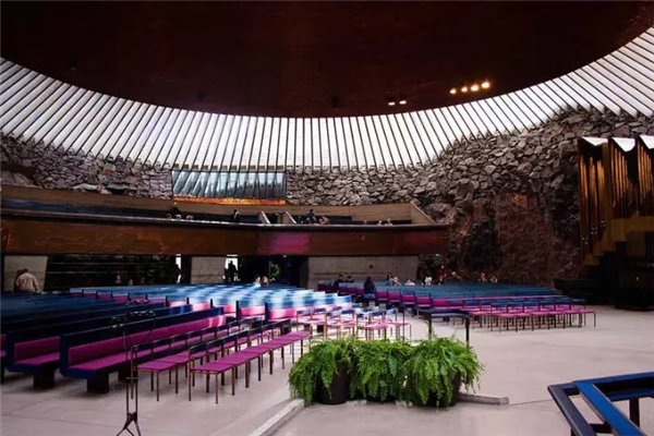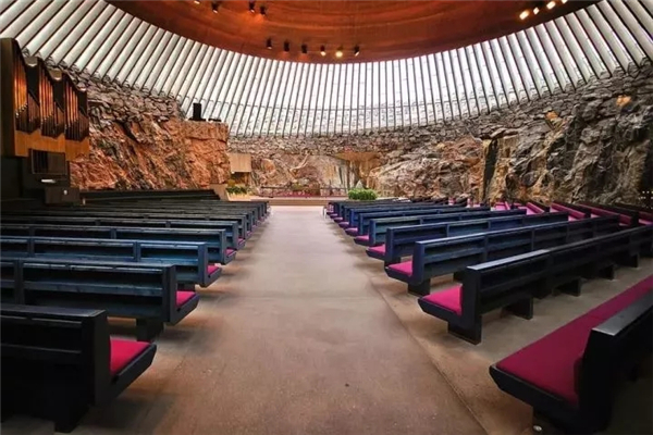 芬兰人崇尚自然古朴的审美情感,在此得到了充分体现,岩石教堂内的中心区域有一个圣坛,与玻璃屋顶所射下的自然光芒相互辉映。在岩壁的回音作用下,教堂音效奇佳,除周日礼拜,也有很多音乐会选择在这里举行。