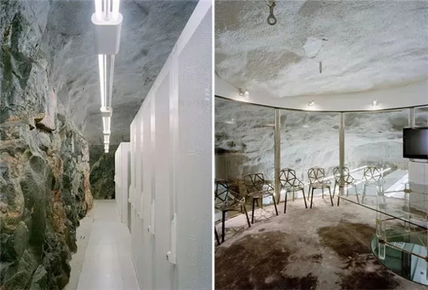 位于瑞典斯德哥尔摩的 Pionen – White Mountain,实际上是一个前地下的炸弹收容所。这个项目是由互联网提供商委托建筑师设计的,主要分为办公空间和设备储备空间两部分。