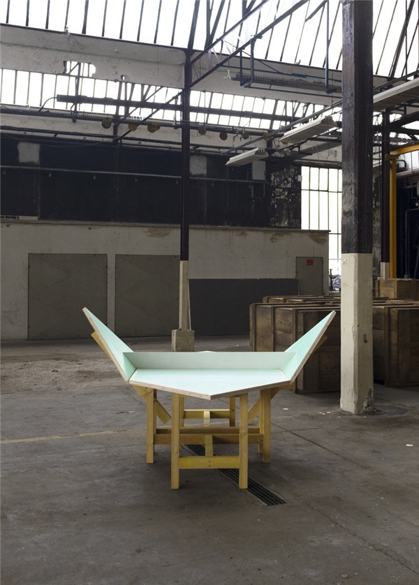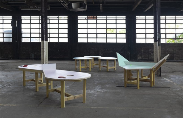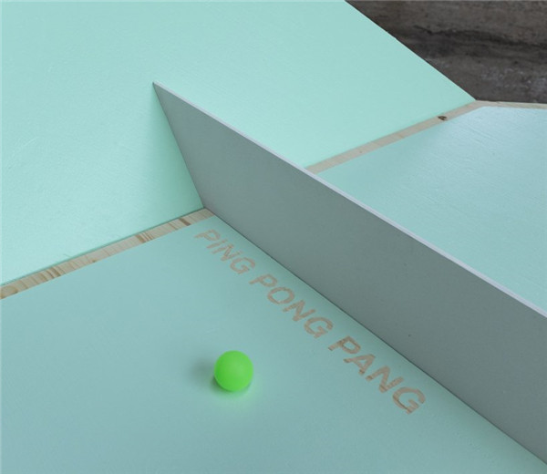 二人组利用简单的木质结构搭建出三款不同的乒乓球台。其中一款灵感来源于triolectics的概念,这个概念由asger jorn 发明,在三边足球中可以得到简单说明。利用这款球台,玩家需要保证球越过桌与桌之间的缝隙而不是传统球台上的球网。