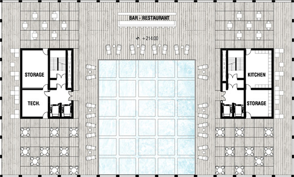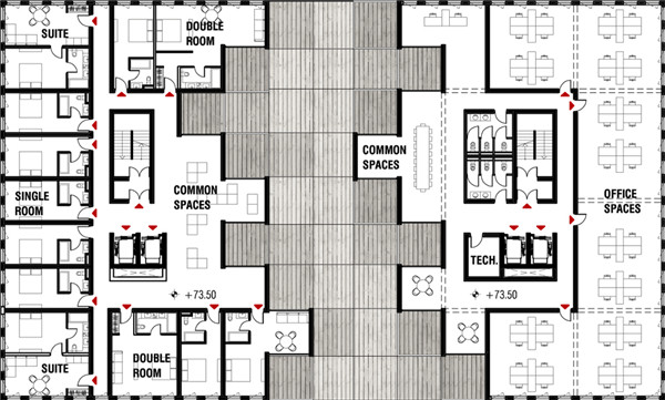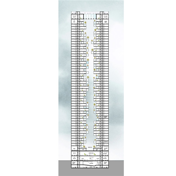 整座摩天大楼被分为四种主要功能区域:酒店大堂,包括一家餐厅、一家酒吧、礼堂和健身房;酒店居住,有不同客房类型、公用空间和公共露台;企业孵化器,包括办公室、会议室和协同工作设施;屋顶泳池,附有餐厅和酒廊。