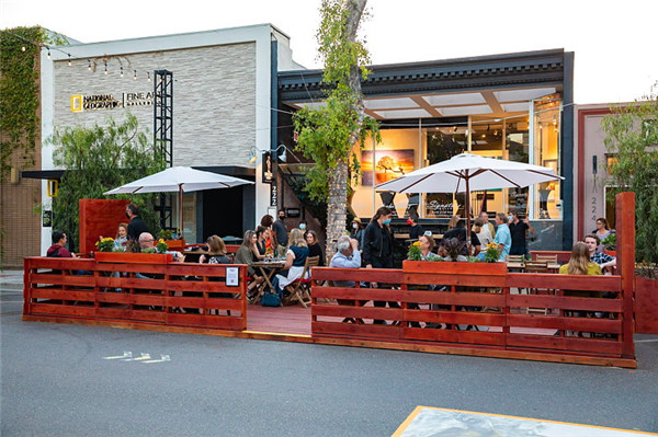 SWA's kit of design elements includes wooden decks fashioned for different uses. Dining decks feature high railings (made of wooden pallets) and accommodate movable tables and chairs for expanded restaurant dining space that conforms to liquor licensing as well as social distancing requirements. SWA's plan included utilizing rentable furniture, a key component for affordability. The firm also introduced merchandise decks that provide protected, open-air space for retail stands on the sidewalks. Performance decks provide space for soft programming and live entertainment. A projector screen is included to showcase local musicians and other cultural arts performers, and will eventually transition to hosting a solo live performer. String-lights are introduced along the street to foster a spatial definition and a feeling of festivity. The promenade includes multiple opportunities for the engagement of local artists, including temporary art installations. All of these elements can be easily modified and replicated in other locations nationwide.