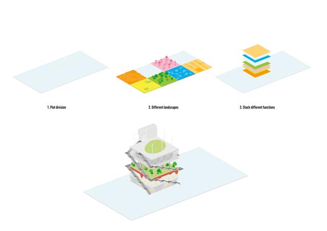 新项目保持了 "堆叠景观 "的概念,对现有建筑进行改造,并沿着原开放场地的边界增加两座阶梯式建筑。改造后的展馆将作为公用办公区和会议室,而森林层、地面 "沙丘"、屋顶穹顶和外部楼梯将被保留。两座新建筑中体量大的作为学生宿舍,体量小的作为办公室和停车场。这些建筑围合了场地,阶梯式向西面下降成为场地的入口,能到达景观庭院和汇聚中心。阶梯状的屋顶被打造成带有花园和运动设施的彩色梯田,向下再到学习区域和电影院。