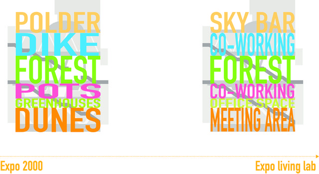 原2000年世博会展馆的设计是对世博会上荷兰的主题 "荷兰创造空间 "的回应。六个荷兰景观被叠成一座塔,而其余区域则成为世博园内的户外开放空间。多年来,它因为自成一体的生态系统,成为可持续设计的著名参考范例。