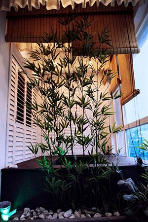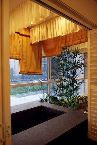 结合阳台特点大胆的在主卧阳台设计浴缸,结合青石、绿竹,竹帘,纱缦营造出室内私人SPA的舒适空间。