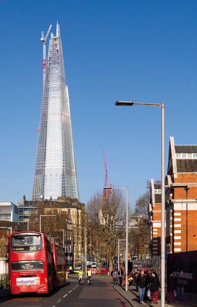 如果把1016英尺的The Shard与2723英尺高的Burj Khalifa塔相邻,它就显得比较娇小。但是在伦敦,与跟它相邻的One Canada Square相比,它就显得比较宏伟了。The Shard旁边建筑都基本不超过15层,如此它就显得鹤立鸡群了。只要你在伦敦,无论在哪你总能看到The Shard的身影。有批评者曾评价说:它大的有点疯狂了。“卫报”也曾有文章说它是“arrogant”,是伦敦最突出的建筑。在伦敦大部分高层建筑都建立在Canary Wharf和一些知名的经济商圈,比如说Foster's Gherkin、KPF's Pinnacle以及Rogers's Cheese Grater。