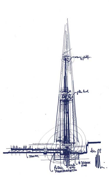 起初The Shard是作为经济政治商业用途建筑的。在2000年英国政府发布了一项政策,鼓励高层建筑教集中的区域进行有条件的转型。Sellar认为这是一次机会,就聘请了Renzo Piano Building Workshop对该建筑进行了改建以及修缮等。