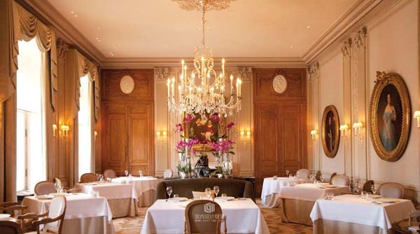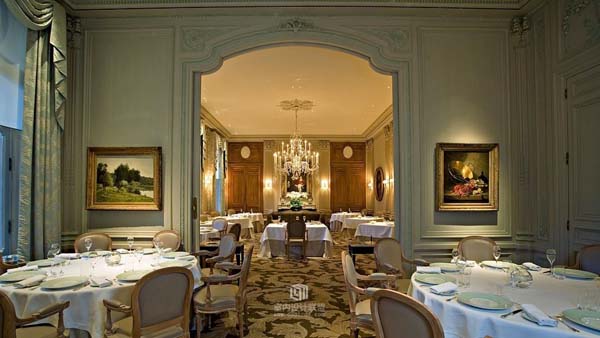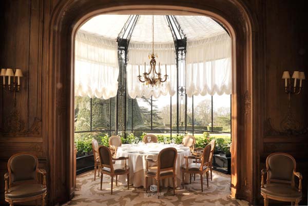 这座占地17英亩的酒店是上世纪初时,仿造一座18世纪的古堡而建。走进充满宫廷感觉的大厅,四周挂满了华丽的人物肖像画,那些肤若凝脂的贵妇和头戴假发的贵族们微笑着,似乎要从画中走出来,邀人共跳一段华尔兹。每间卧室里都铺上了柔软的垫子,窗台的栏杆上装饰着白色棉纱,床单和窗帘则运用粉蓝、粉红和银色。客厅里高高拱起的天花板上悬挂着庄严、厚重的巨大吊灯,而餐厅装饰有栩栩如生的小天使,精致的织锦,镀金的塑像,一切令人常常有时空倒转之感。这里处处是精致华丽的古董与装饰,处处留下了名人的踪迹,并且以他们的名字为这里的房间命名: Pierre-YvesRochon、Taillardat 、Pothault等是餐厅的名称,Rubelli, Frey, Canovas, Flipo of Laura Ashley则成为风格迥异的卧室的署名。