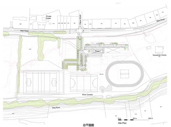 建筑地点有一个值得注意的条件,那就是毗邻Disa河,这条位于豪特湾山谷中心的河流将平顶山的南端与大西洋衔接了起来。从这个角度仰望,人们能一览豪特湾的全貌。周围山峦的“轮廓”始终能映入眼帘。建筑庭院以此为基础,向天空开放,也能欣赏到平顶山、Constantiaberg和 Karbonkelberg山的风光。在教室、实验室和办公室里,总有一扇窗是能够欣赏到山峰景色的。