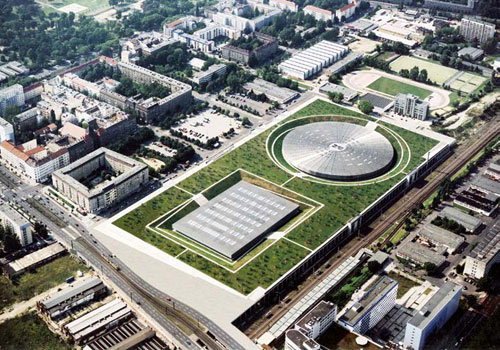 这项工程与两德的重新统一紧密相关。当时,柏林即将重新成为国家的首都,全城热切盼望获得举办奥林匹克运动会的机会。最初,柏林参议院众志成城,强烈希望重新部署城市的两个部分,将其连接起来。奥林匹克工程作为一个统一化的项目,使规划者不仅能设立若干运动设施,还可以创造出服务于体育设施的一系列服务体系。正是在这种热情与争议并存的语境下,柏林市政府举办了一场国际竞赛,竞标奥林匹克自行车馆和游泳馆的设计。项目选址位于两个重要的都市元素的交叉点:其一为一条宽阔的城市大道,从城市中心(朝着莫斯科方向的亚历山大广场)引出的主要中轴线;其二为一段短程的地铁线路,将东西链接在一起,使整座城市之旅成为可能。