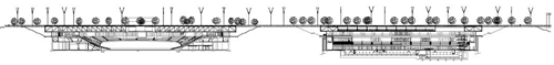 这是不同网络的衔接点,但同时也是不同城市肌理的咬合点。系统的凹面部位包含了一个实体,其肌理是典型的柏林体块组织形式,此外还包含了原柏林屠宰场;另一方面,在铁路轨道的远端,20km 开外的空间内都是板房公寓楼;这在当时是另一种截然不同的都市形态。为使两套体系完美融合,建筑师决定以一种明显的实验性的手法,使奥林匹克游泳馆与自行车馆这两座建筑消失在视野范围内。
