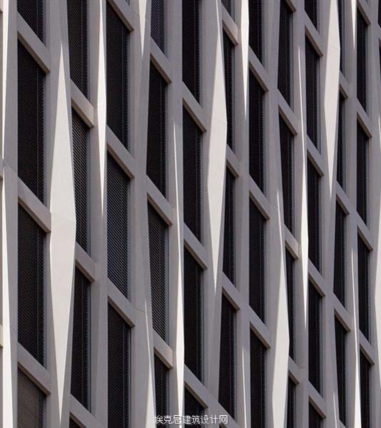 立面网格使用表面深度和雕刻感定义并且加强楼房的垂直感。立面网格是由对角线方向重复的几何图案花样组成,想厚窗帘一样包裹着楼房的角落。同时他也作为私密室内空间和开放外部空间的调剂。