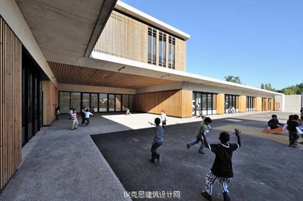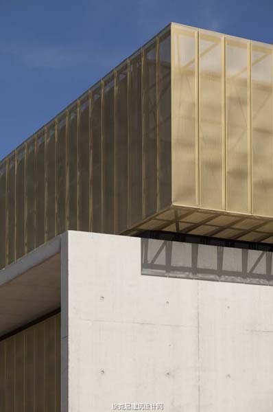 学校和图书馆的入口为所有设备的双倍高度空间。普通的建筑表面处理加之采用的材料强化了该建筑的整体功能性主题。突出的混凝土板从一个建筑到另一个,形成屋盖、墙壁或屋顶。