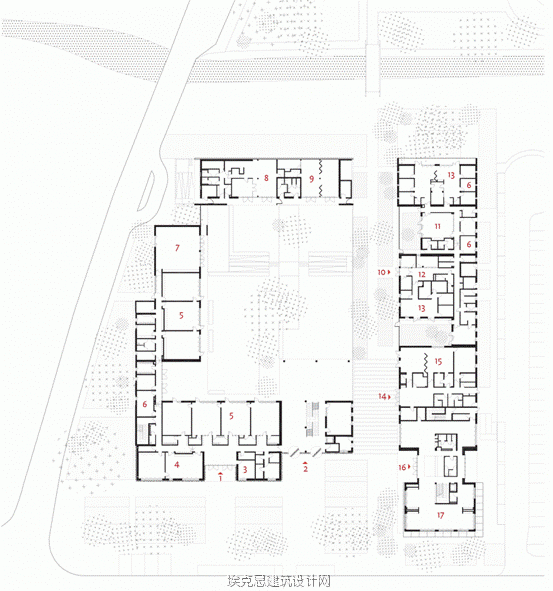 主建筑的地理位置优越,位于建筑场地的正中心,建成了一个正方形布局的标志性公共空间。在其北部边界沿着溪流拟建一条行人路。该项目的重点在于七个建筑体间的互补,以及入口庭院和小巷共享性。该项目的各个建筑体分布在整个场地,从前院到河流边的功能室。