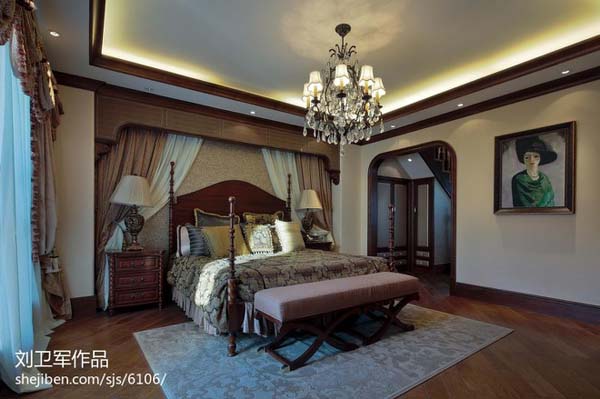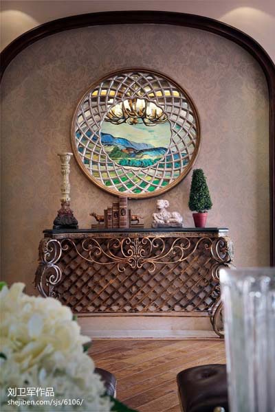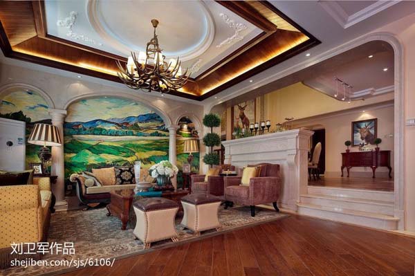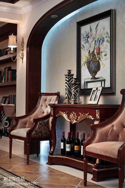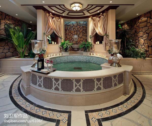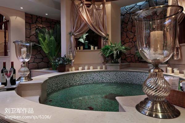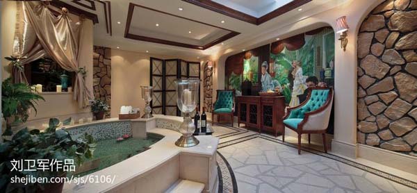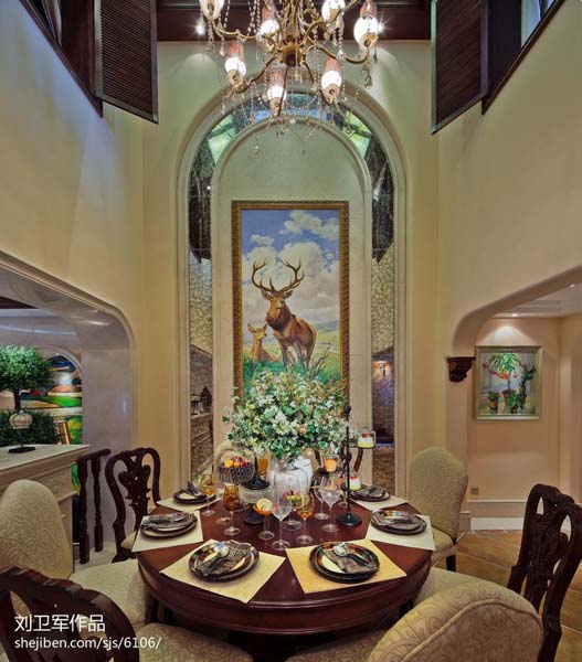 别墅共设有四层,外加一个地下层。负一层的休闲区极具特色,原石堆砌的墙面上装饰着一个狂野的狮头,而潺潺的流水从它口中涌出,缓缓注入泳池。倚靠泳池边上,倒上一杯醇香的葡萄酒,在摇曳的烛光里,在缭绕的烟雾中,隐约可见的挂画,与亮眼的椅子和典雅的家俬一起形成一道优雅的景观。转身而上,餐厅里巨幅的墙画在一片厚重的棕色里面尤为显眼,挑空的设计让客厅空间感十足。拱形的罗马柱和门洞设计令客厅里别有洞天。铁艺装饰,水晶吊灯,厚重的实木家具赋予整个空间沉稳的优雅、大气,地中海元素的使用为其增添几分生机和活力。