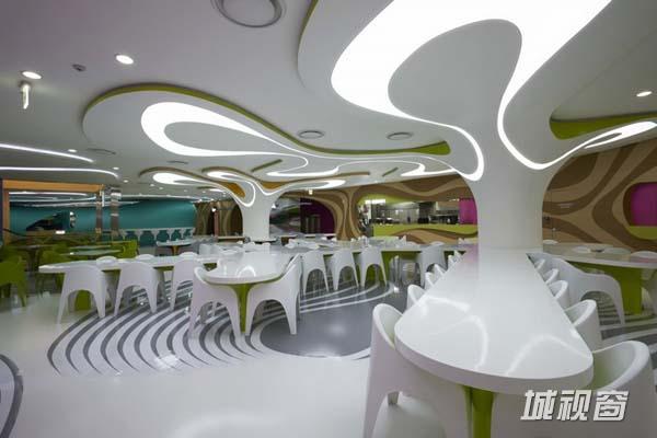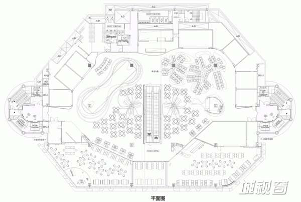 这些岛屿以离心方式布置,引领客人相互交流、交际、沟通。这将创建一个生动活泼的动态环境,生成场所意识,最终将成功塑造空间。周边的墙体形态连绵起伏,墙上穿洞,为服务柜台提供视觉开口。小吃摊位“嵌入”周围墙体之中,为室内的人们创造了不容忽视的视觉焦点。地面的流线型花纹打造了强大的线框,在空间内形成了连续不断的动态效果。一面牢固的动态演示墙作为空间的背景,创建了一个视觉焦点,同时还遮住了公共空间的垂直交通流线。