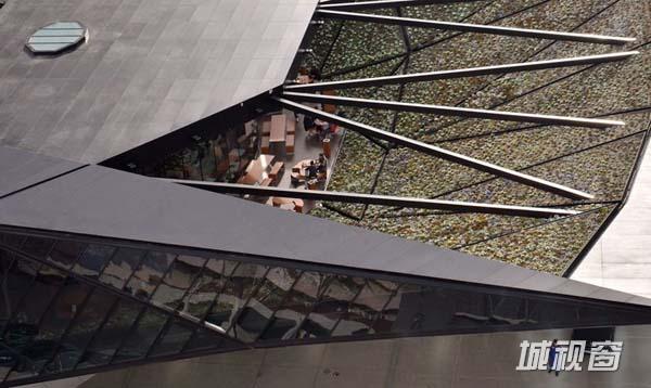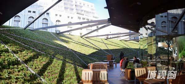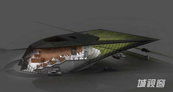 在就餐空间的一部分区域可以看到室外的水景,其他部分则无缝地过渡到二层的露天天井中。天井的四周被围合起来,可以隔绝外面的噪声,创造安静的露天就餐环境。覆盖在加油站上方的巨大的悬臂式雨篷上的绿色植被层增添了自然环境氛围,同时还起到了为餐厅提供生态保护的作用。