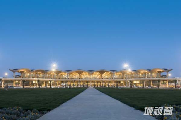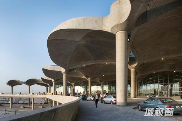 安曼是世界上人类持续居住的最古老的城市之一,机场的设计与当地的建筑相呼应,具有一种地域感。这一点在机场隆起的屋顶上体现得特别明显,从空中看,这些隆起就像是贝多因帐篷随风鼓动起来的黑色布料。建筑还参照了约旦人热情好客的传统。为了迎合家庭成员在机场聚集的习惯,前厅进行了扩容,用来设置带座椅和树荫的景观广场,人们临行前可以在这里跟家人道别,也可以在这里为到港的家人接风。