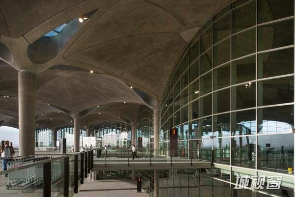登机口的两排墩座沿着中央建筑的两侧排列,墩座内容纳主要的手续办理区域、商店、休息处和餐厅。在这些体量的中央有一系列露天的庭院,这是该区域的本土建筑所具有的特征。这些庭院有助于航站楼实现环境可持续性策略:植被和树木可以过滤污染物,并可以在空气进入空气处理设备前对其进行预先处理,反射水池将散射的自然光折射到机场内部。