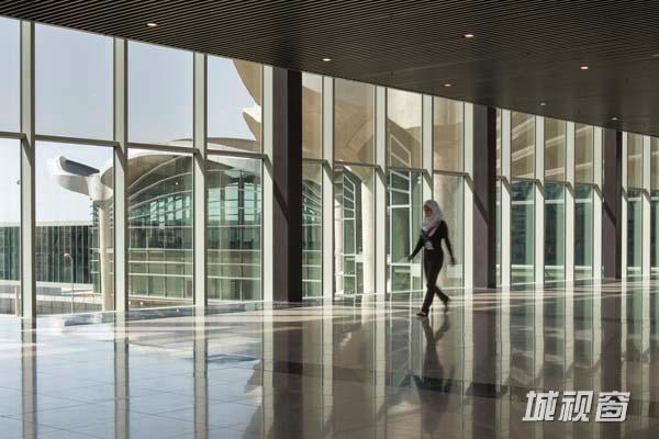 考虑到安曼地区昼夜温差极大的气候条件,建筑大部分采用混凝土材料。混凝土具有很强的蓄热能力,可以起到被动的环境控制作用。棋盘拼花图案的天篷由一系列弧度较小的混凝土穹顶组成。穹顶向外延伸,将立面遮挡起来,每个穹顶就是一个施工模块。穹顶从支撑柱开始向外伸展,形态类似沙漠棕榈树的叶子。日光从柱连结处的组合梁处进入其下的广场。为了与叶脉的形象相呼应,每个裸露的拱腹都采用了以传统伊斯兰形式为基础的几何图案。屋顶壳体复杂的几何形态和建造策略是建筑师同 Foster + Partners事务所内部的几何结构专家共同开发完成的。