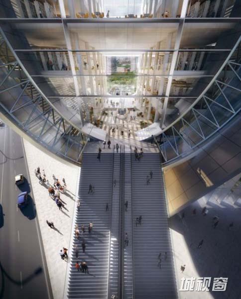 这些圆柱体通过旋转,在场地上创造了双轴效果,方便来自临近街区的和公园的行人通行。而且,这种转动也具有文化寓意——“它是一扇通向未来的可靠大门,一个再生的社区生活中心,一个指引方向的路标,而且每个建筑轴都指向了公园和城市的关键之处” 。