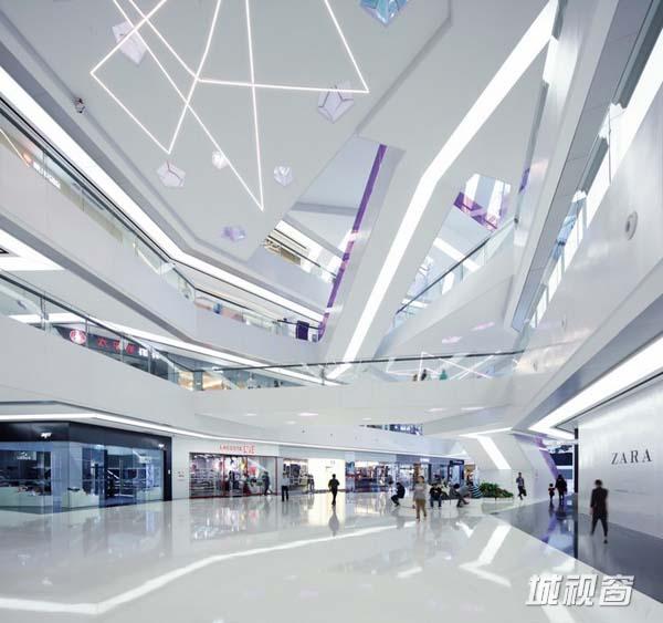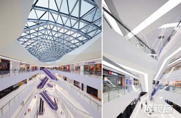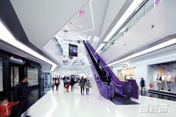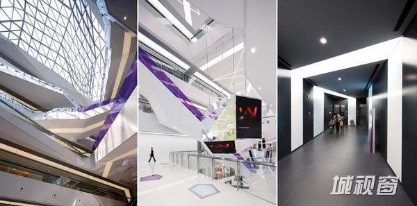 作为多面体面的延伸,水晶般的LED广告灯箱悬浮在中庭上空,成为人们进入商场的视觉焦点。在颜色质朴的白色室内中庭内,色彩鲜艳的自动扶梯起到了强调的作用,这些扶梯如雕刻一般安装在中庭的中央。线性的LED照明吊灯悬挂于活动广场内部上方。背部采光的地面窥视孔布满了整个中庭连桥,就像散落在地上的珠宝,为空间增添了一抹生气,吸引了许多好奇的围观者。主要材料有:黑色和白色的人造石、可伸缩的天花板灯箱、着色的层压玻璃、彩虹色的有机玻璃、复合铝面板以及玻璃纤维石膏板。