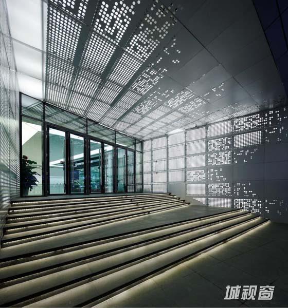 立面上贴挂着颜色变幻的铝质面板,营造了一种不断变化的外观。虽然大多数面板都属于建筑的表皮,但是总有一些表面是服务于关键的视觉功能的,譬如照明灯箱、广告以及三张LED屏幕。每当暮色降临,灯光从铝板上的穿孔中透过,就描绘了一幅繁星满天的夜晚画面。