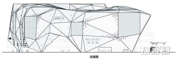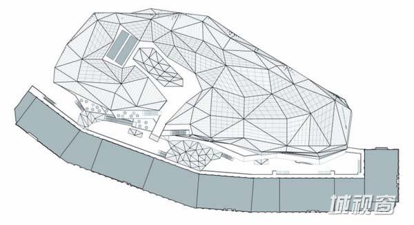 本建筑呈多面体的造型,这是为了服务于平面布局和建筑立面中的不同的功能。建筑外围护结构被设计成半开放式,提高了从人行道上看到建筑内部的视线的通透度,这也有助于吸引更多人进入。与一些让行人快速通过的笔直街道不同的是,波浪起伏的出租空间立面促进了行人交通数量的自然涨落,创建了一种动态的购物体验。