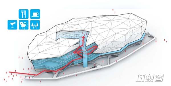典型的购物商场一般将电影院和KTV等功能空间设于商场的顶层。这些地方一般一直营业到后半夜甚至凌晨,而其他零售设施早已关门。所以电影院和KTV等场所的顾客在夜晚进出还得经过一段黑暗、没有空调的空间。