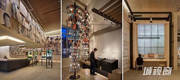 走进中心,五个系列画廊将游客带入探寻历史并追寻未来的数字化多媒体中心,包括声音画廊、家庭与基金会画廊、合作者画廊、剧院和灵感创新画廊。展厅由一组巨大的、独立钢片电枢纽板组成,整个设计期望在访客与展品之间形成一种互动关系,并相互支撑发展。整个中心在建造过程中采用了一系列节能环保设计:使用经过美国联邦科学委员会认证的白蜡木和人工木材、运用信息图形技术奖图像直接转印在木材之上,从而降低了能源消耗。
