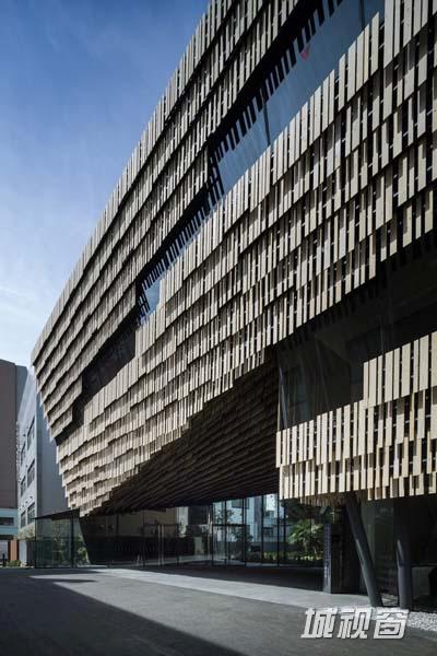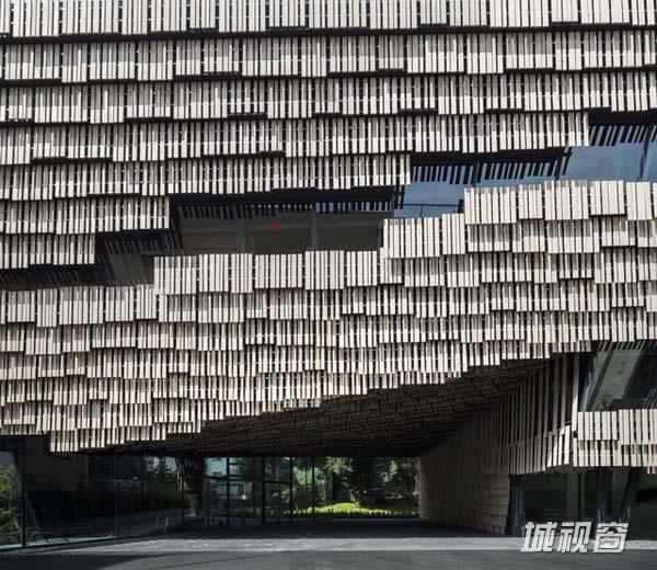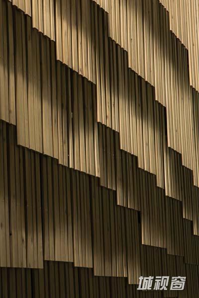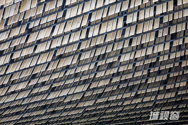 大楼外面覆盖了一系列面板,这些面板由一根根的木条组成。