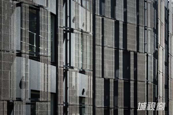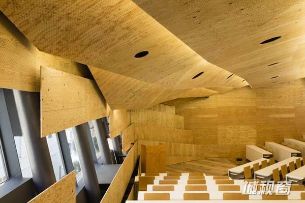 这座建筑的设计特点在于其分层布置的外立面,楼的外面覆盖了一系列面板,这些面板由一根根的木条组成。如果自然光穿过玻璃,当自然光穿过玻璃,照进这个精心设计的内部空间,木板层的层高韵律感就会被打乱。在底层有一条通道,连接着建筑前面的街道和校长会宾室后面的日式花园。 这一条公共通道的设计还巧妙地分流了校园内的光线和气流。如果没有这条通道,光线流和气流就会直接正对着闯进木板层。