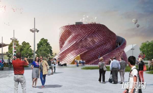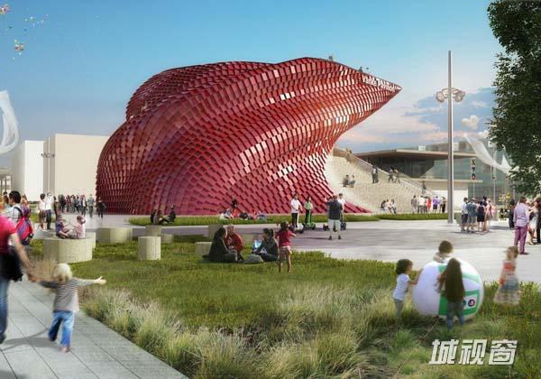 万科馆紧邻阿瑞娜湖,1000平方米的展馆像是从东方升起来的,形成了一个动态的垂直景观。其内外部间的音乐比例、弯曲的几何形状及流行感创造出一段时间和空间的旅程。红色蛇纹雕刻形式盘旋而上,中间一个大楼梯身着白色的马赛克瓷砖。站在顶部的屋顶观测台可以欣赏湖水和附近意大利馆的美景。该展馆外面镶嵌着创新的三维红色金属化瓷砖,这是丹尼尔•里伯斯金和意大利CasalgrandePadana公司精心设计完成的。这种几何陶瓷面板不但创造一个新颖的表达模式,而且他们拥有高度可持续的自清洁和空气净化性能。