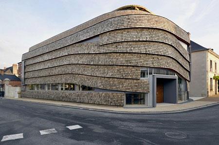 建筑巨大的体量从外观给人一种压迫感,整个建筑像一个巨大的茧悬浮在森林中,几乎完全封闭的结构,没有窗户。外观开孔结构只在一楼。一楼是一个黑盒子,可常设展览。外墙的曲率立面让人印象深刻:在传统街道中,你会突然发现了一个软的、自然的结构,优雅地融入周围的环境,而不是棱角分明的设计强加在本身就蜿蜒的街道,蜿蜒地穿过街道森林。立面使用了传统的板栗瓦材料,不规则的覆盖使建筑像一个活的有机体。板栗瓦的寿命是一个多世纪,未来将褪色成为灰色。