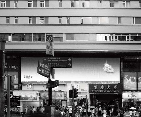 在尖沙咀弥敦道鳞次栉比的繁忙商厦中,名声最响但风评最差的,大概要数重庆大厦。天黑以后,从北京道走到弥敦道路口时,如果猛一抬眼,多半会被对面那个细长的黑窟窿吓一跳,再看得仔细些,黑窟窿上还有密密麻麻的小黑窟窿(窗户)和更小的黑窟窿(空调外机)。它并不是漆黑一片,但是窗户里透出的微弱灯光和周围闪烁的霓虹灯形成的反差太过强烈,以至于造成了巨大的吞噬感。这是相当长一段时间以来,观看重庆大厦的最震撼视角。不过,从大厦门前走过,反而很容易错过它,因为入口不大,视线范围内也没有明显的招牌。离它最近的出口是尖沙咀地铁站 N5 出口,这个出口没有电梯,楼梯尽头是一条有些脏乱的小巷,小巷里有一家7-11便利店,夜晚光顾的大都是非洲人和南亚人。有一天凌晨,我因为好奇而走进紧邻大厦的阴暗巷道,但又因为紧张而走得太快,只隐约瞥到两个倚墙吐烟圈的黑人和在巷口流连的性工作者。