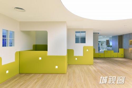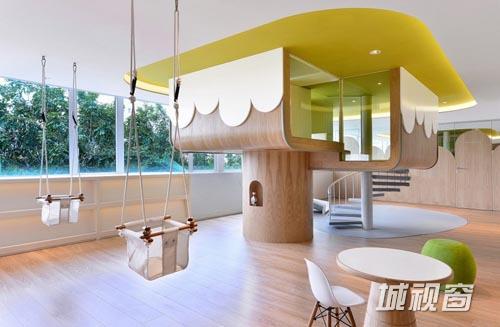 整个儿童中心都没有童话式的装饰元素,避免落入俗套,取而代之的是中性的设计,白色、浅绿、浅蓝的色彩运用和木材将大家的思绪带回美好的童年时期。咖啡屋中的树上小屋和秋千的设计灵感来自于户外的绿色植物,丘陵状的设计营造了舒适的阅读和上网空间。