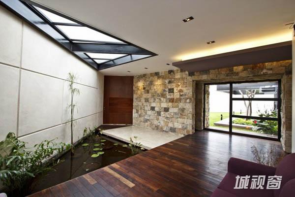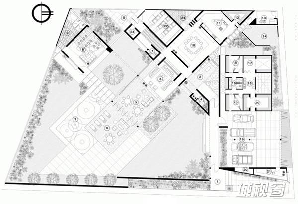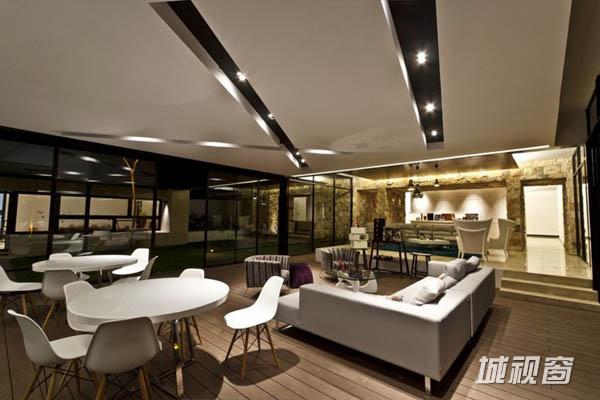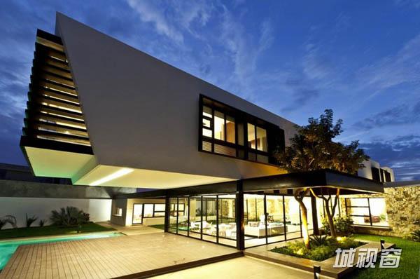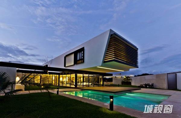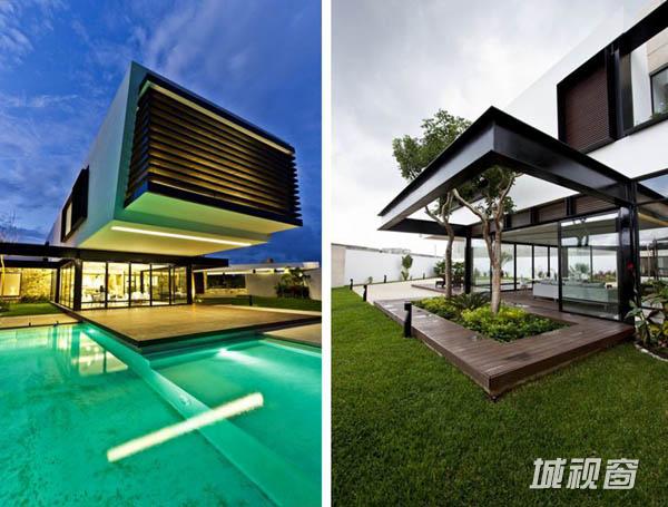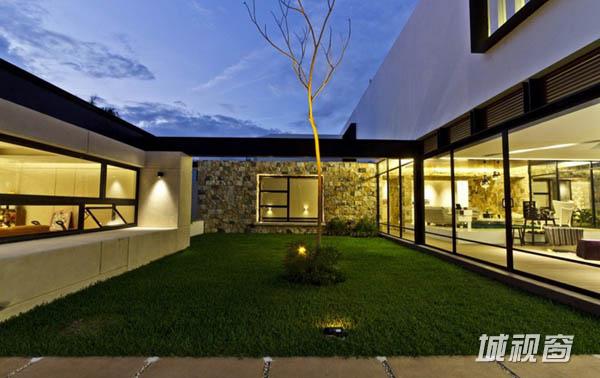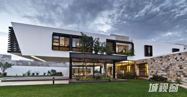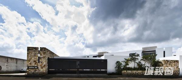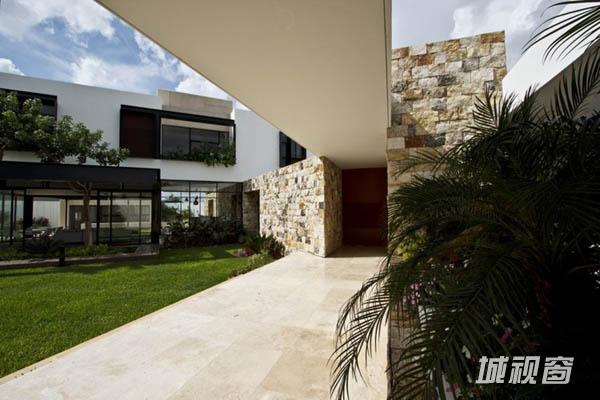 Temozón别墅位于尤卡坦一个住宅区内拐角处一块不规则的四边形场地上。长边长60m,朝东;39m长的一边则朝北。建筑师意在为住宅空间营造不受墙壁限制的家庭氛围,将室内外空间融为一体,突出不同空间的视野。为了实现这一目标,建筑师将原本的一个走廊翻转45°,以调节风向和更好地发挥空调的功效。这一改变也将花园融入住宅区。最后,为了强化设计概念,走廊被划分为两部分。第一部分位于悬浮于地面之上的坚实体量上,容纳着私人区域和社会区域,由不同楼层间的平台组成,定义了空间层次。