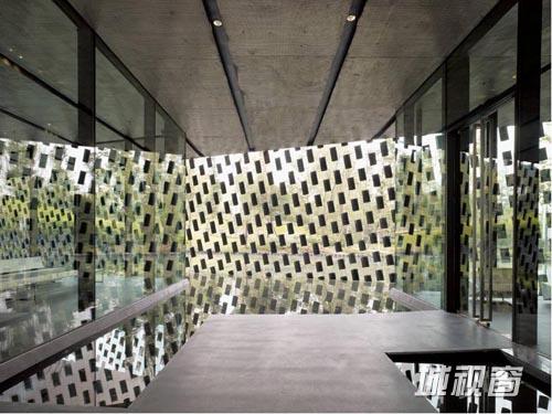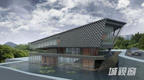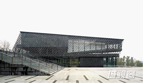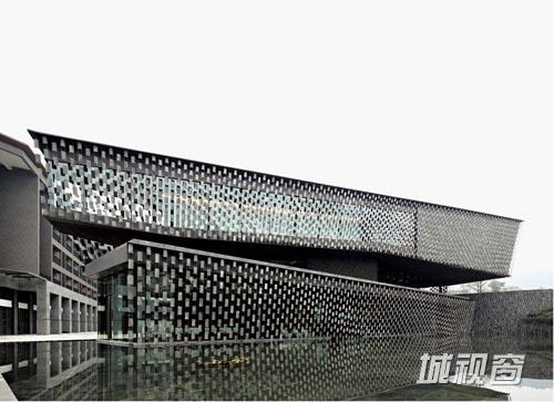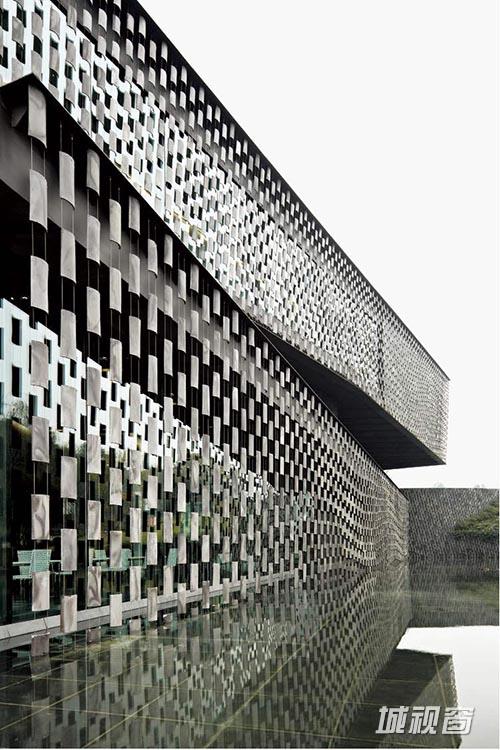 知·美术馆是目前隈研吾在中国设计的唯一的美术馆建筑。这地处新津县老君山下的四层建筑,总建筑面积约2500平方米,远看呈深灰色,外立面悬挂的是用特殊材料的绳线串联的深灰色瓦片,建筑周围是灵动的水面,一静一动,使整个建筑物外形既有流畅的动感,又有含蓄内敛的气质。隈研吾的建筑设计理论最重要的是“让建筑消失”。通常他让建筑消失的方式就是与自然融合。在这一项目中,隈研吾通过水来衔接天与地,让建筑与自然有机地结合在一起。