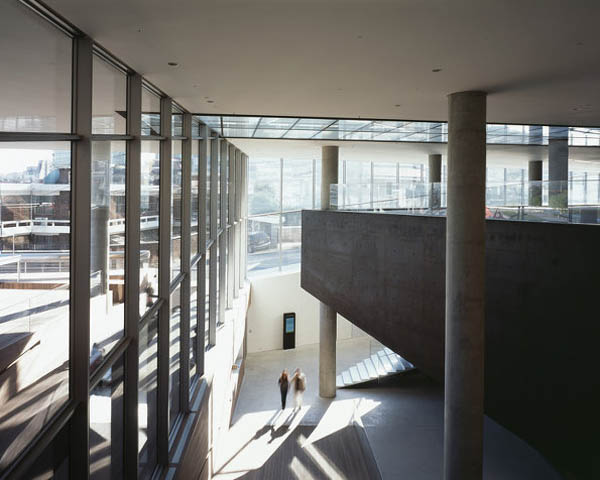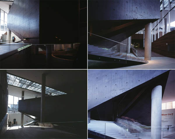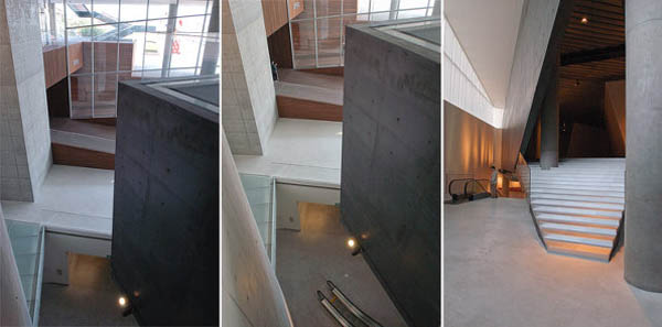 经由直通多功能室的坡路穿过OMA大楼可到达美术馆综合体的入口。OMA设计方案的一大特色就是庞大的黑色混凝土盒体外形,游客们在入口处就直面建筑。地形波状起伏,盒体就悬浮在挖掘出的大片土地上,为空间内部营造了变换的光照条件。空间流线围绕黑色盒体展开,可在建筑上下及内外自由活动。这为游客们提供了丰富的体验,感受建筑、场地和城市之间充满活力的关系。