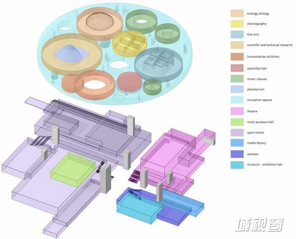 “盒体”用民族装饰品进行美化,逐个堆叠,令观赏者联想到毛毡手提箱(shabadan),是蒙古包内部一种传统的装饰品,显示了游牧民族的生活方式。圆盘空间容纳了多种多样的兴趣小组和部门,而建筑平台的绿色屋顶则被解读为散步和观景平台,在高楼林立的市中心模拟草原景观。